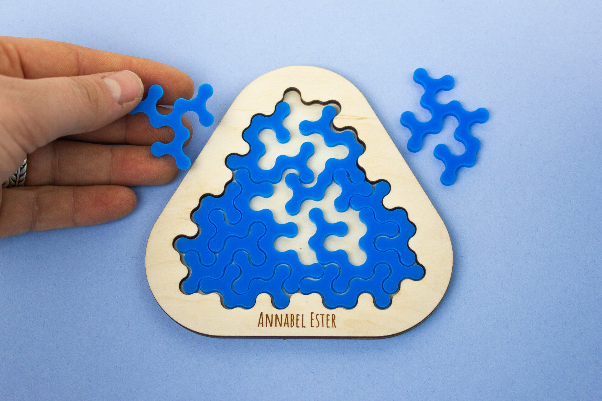 Alles wordt met de hand gemaakt en daarom is iedere puzzel, houder en verpakking uniek. Er worden alleen hoogwaardige materialen gebruikt. De verpakking is gemaakt van gerecycled papier. De houder is gemaakt van ±3mm FSC gecertificeerd hout en omdat hout een natuurlijk product is kan het zijn dat deze af en toe imperfect is. De puzzelstukjes wordt gesneden uit ±3mm gerecycled/reclaimed acrylaat.