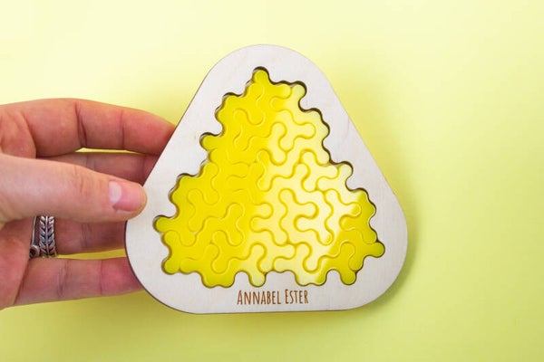 Alles wordt met de hand gemaakt en daarom is iedere puzzel, houder en verpakking uniek. Er worden alleen hoogwaardige materialen gebruikt. De verpakking is gemaakt van gerecycled papier. De houder is gemaakt van ±3mm FSC gecertificeerd hout en omdat hout een natuurlijk product is kan het zijn dat deze af en toe imperfect is. De puzzelstukjes wordt gesneden uit ±3mm gerecycled/reclaimed acrylaat.